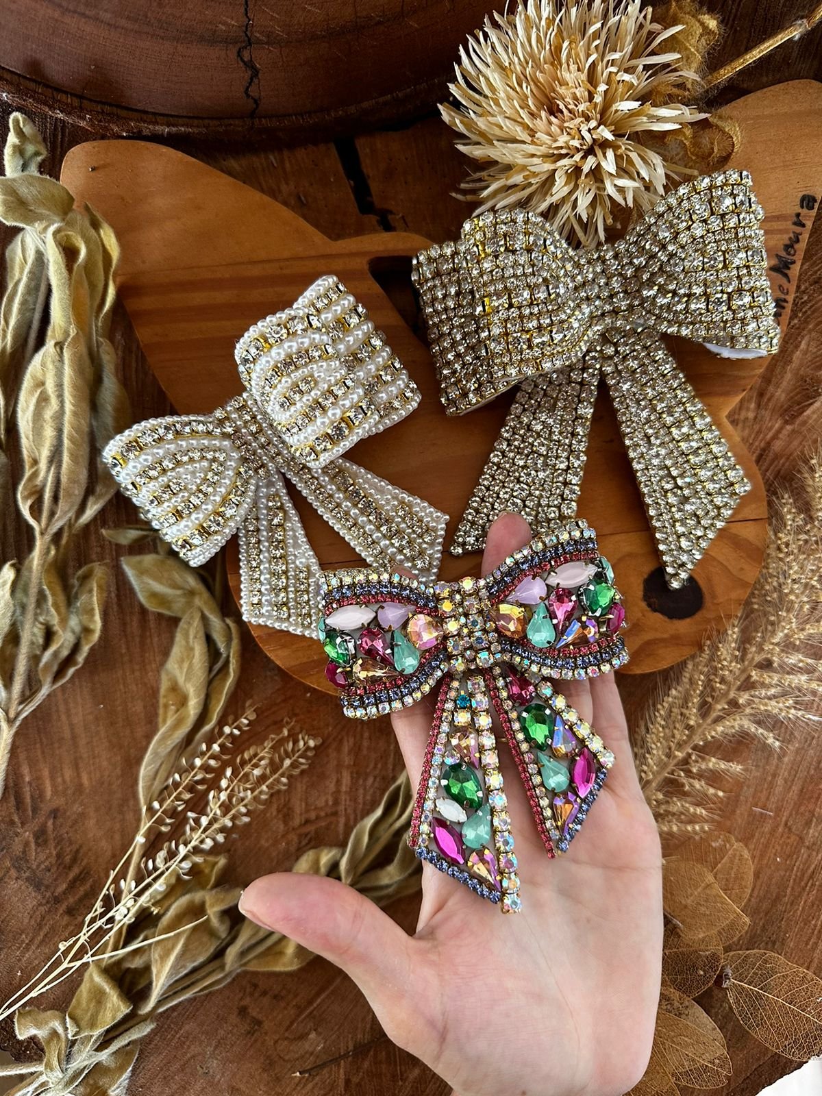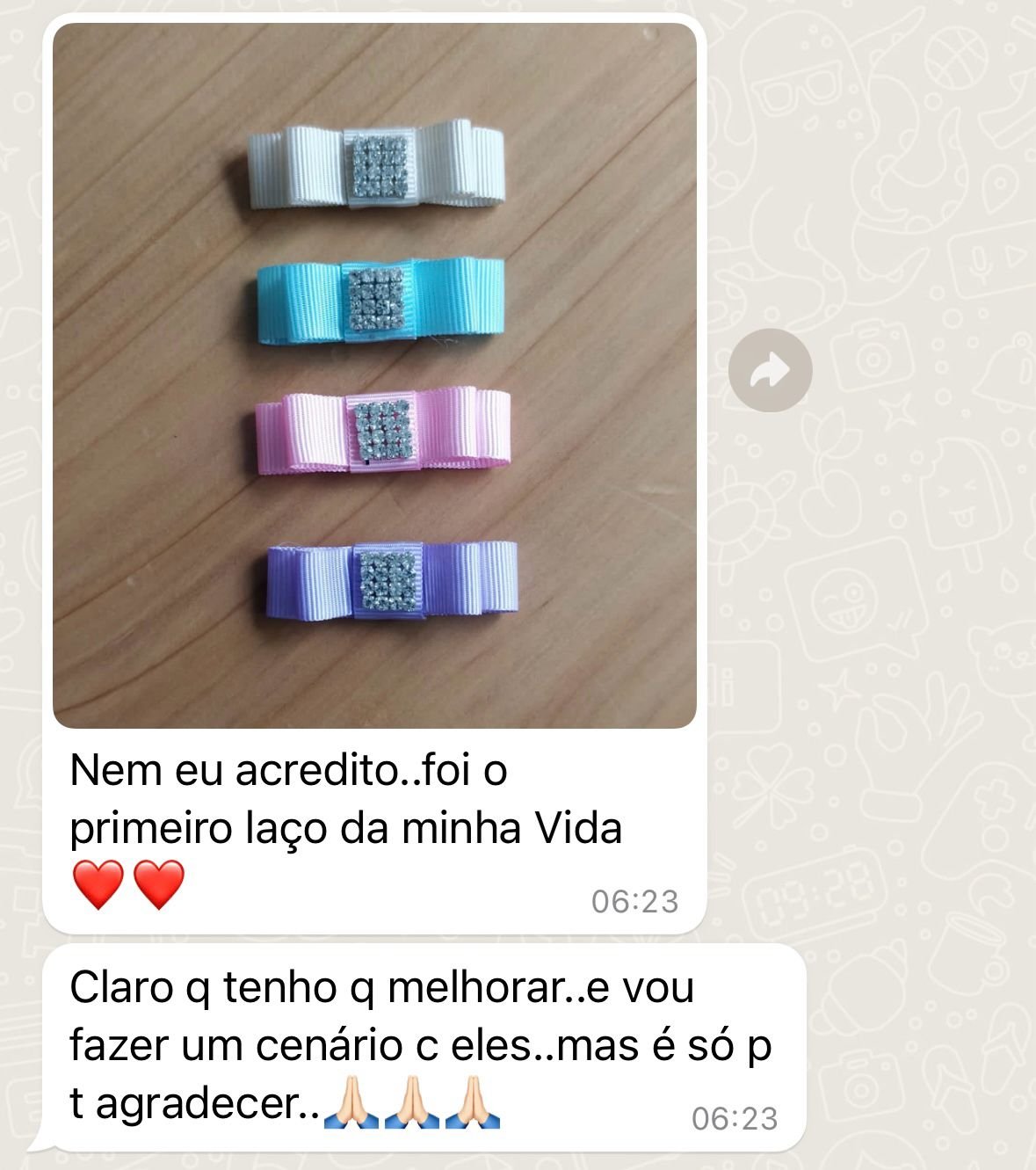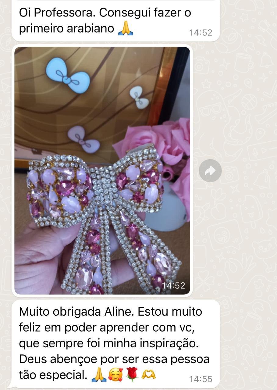 Dentro do curso você aprenderá a técnica do aplique do strass do engrampado e do strass e pérola e como diminuir o laço fazendo proporcional para cada cliente mais Moldes em PDF mais fornecedor com desconto de 20% nas compras.